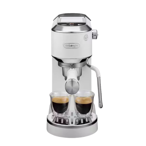 The De’Longhi Dedica Duo EC890.W White is a sleek, compact espresso machine featuring a 15-bar pump, cold brew function, and My LatteArt steam wand.