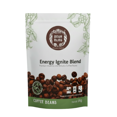 Boost your day with Bean Bliss Energy Ignite Coffee Blend, a high-caffeine mix of Arabica and Robusta beans. Rich, bold, and smooth flavor with a full-bodied aroma. Perfect for espresso, French press, cold brew, and filter coffee. Freshly roasted to deliver gourmet-quality coffee in every cup.